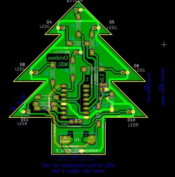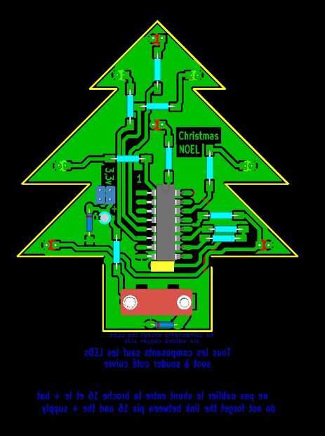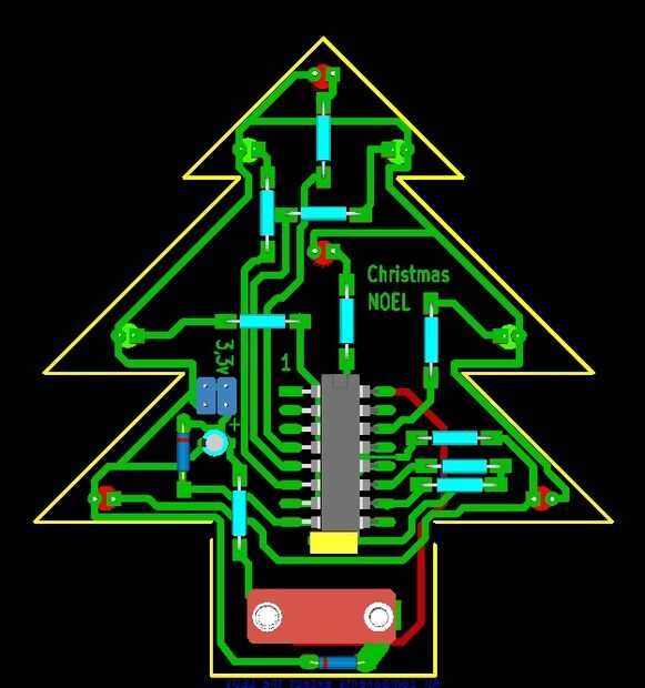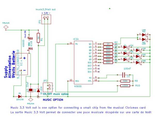 Este árbol se hace alrededor de un contador binario de 14 etapas el CD4060, el oscilador utilizado pernos 9 10 y 11 y el condensador utilizado para este oscilador pueden tomar valores a 100nF 220nF según el ritmo deseado de intermitentes de LEDs vea el diagrama esquemático.