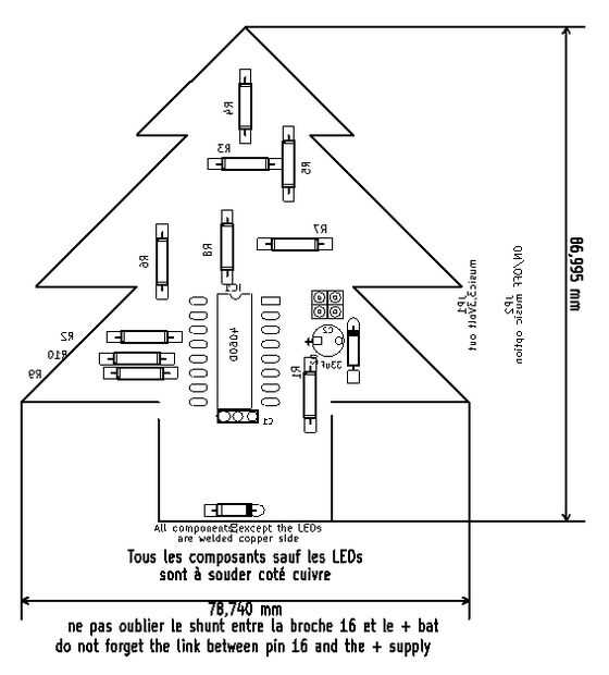 Todos los componentes excepto los LEDs son soldados de cobre de lado el procedimiento es el siguiente: IC: a apoyar la resistencia del módulo musical pin, condensadores, diodos y doblar las piernas con la horizontal, cortar y soldar como CMS, 9V de presión de soldadura (sin envoltura) y la desviación de la fuente 4060, soldadura del condensador de 10 mF (boca abajo) en el + y - los terminales de la potencia del módulo de la música.