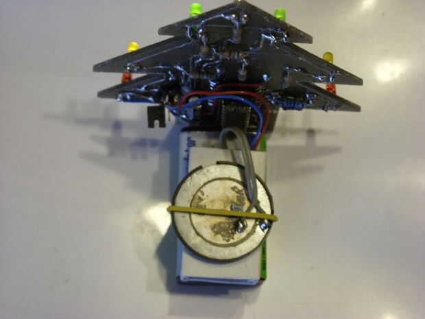 Este escaparate interior de árbol de Navidad animado utiliza una combinación de cinco WS2812 direccionable pixel LED pega la estrella. 16 LEDs de píxel individual ensartados por las luces del árbol de Navidad y una tira de LED verde cortado en tiras
