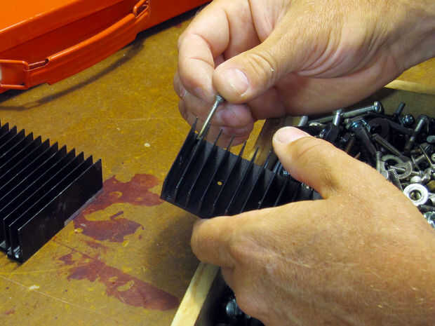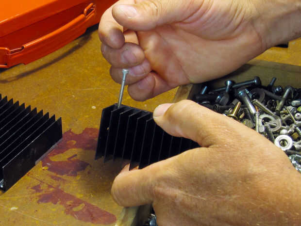 En este caso, he aprovechado de las ranuras del disipador de calor preparada para recibir tornillos autorroscantes. Yo estoy insertando un tornillo en uno de estos canales.