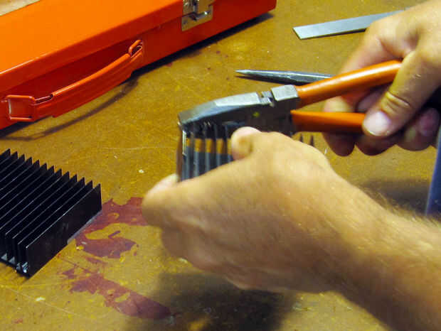 hice este disipador de calor en una prensa del taladro con una dremel, algunos archivos y papel de lija. Se corta de varilla de aluminio de diámetro 1/2 pulgada que tiene una pulgada de largo. Las "aletas" no son perfectas como la dremel mantuvo