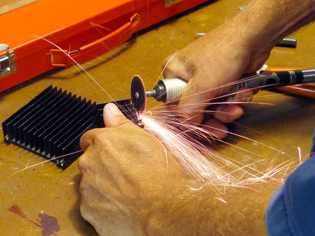 hice este disipador de calor en una prensa del taladro con una dremel, algunos archivos y papel de lija. Se corta de varilla de aluminio de diámetro 1/2 pulgada que tiene una pulgada de largo. Las "aletas" no son perfectas como la dremel mantuvo