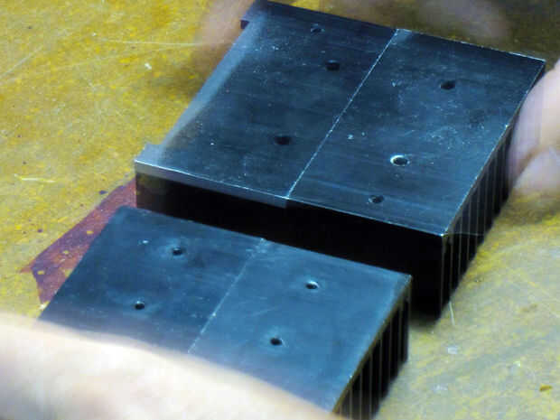 Aquí tengo dos disipador bloques cada hechos usando este método. Para aumentar el flujo térmico a través del disipador de calor, además podría agregar algunos (típicamente blanco con base de silicona) disipador de calor compuesto entre los bloques. Ahora ver si nuestra fantasía pantalones (caliente-casa-flor) LED será feliz...