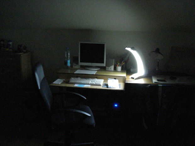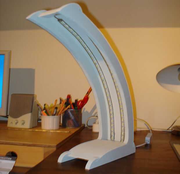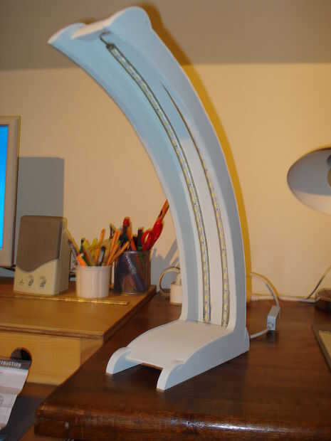 Hola, Aquí puedes ver cómo hice mi lámpara de escritorio. Lo que usted necesita: -placa de madera -1 metro de tira de led -cartón, acero, aluminio, placa de plástico -pegamento -jigsaw