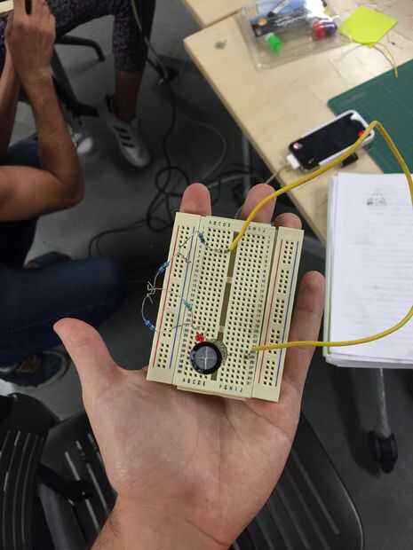 En esta ocasión se utilizará un condensador para situado el LED de manera se pueda observar como éste atenúa la luz del LED hasta apagarse al momento en se agota la energía acumulada. Esto es debido a una de las características eléctricas del condensador: almacena energía y sirve para atenuar la señal eléctrica.