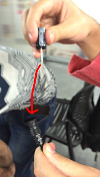 Una vez estemos seguros de tener identificado el positivo y el negativo de nuestro cargador, conectamos el condensador. Positivo con positivo, negativo con negativo.