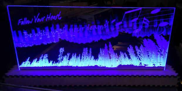 Mi esposa preguntó si ayudaría crear regalos de agradecimiento para su coro de la comunidad que se presentaría al conductor y acompañantes. Me mostró su pardy73 borde iluminado acrílico signo Instructable y le encantó! Máquina de láser de Epilog de nuestro Makerspace yo solía grabar el acrílico, como también crear un marco de caja de madera.