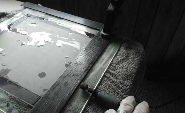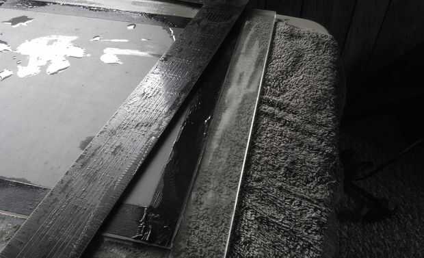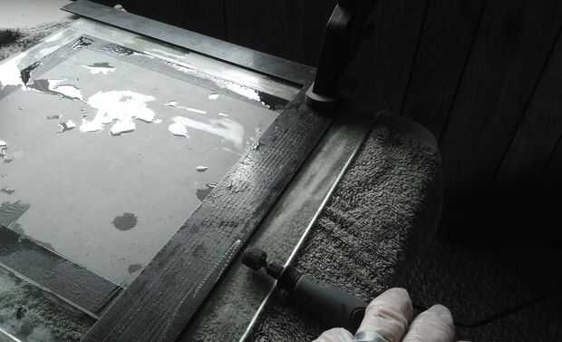 Ligeramente reprimieron una regla de metal y ponlo en el borde de la cinta para llegar a quitar el pedacito final de capa en una línea limpia. No te olvides un poco de agua abajo del vidrio.