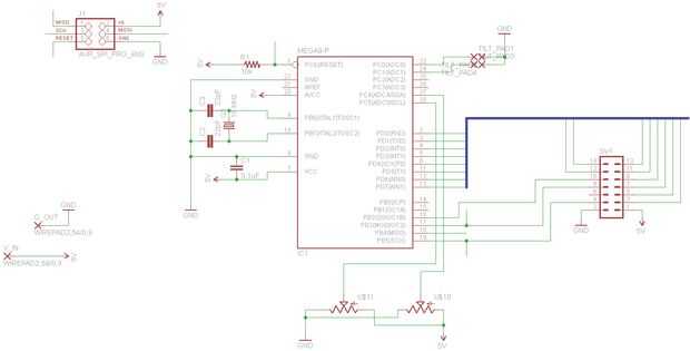 La parte lógica, como lo llaman, contiene el ATmega328p y todos los componentes necesarios para su funcionamiento. El diseño es nada de lo que debe ser desconocido a los que han utilizado un controlador ATmega antes. Acerca de lo más exótico es que el uso de un oscilador externo con requiere los fusibles en el microcontrolador para ajustarse. Con el fin de averiguar la configuración correcta del fusible usa esta práctica calculadora: