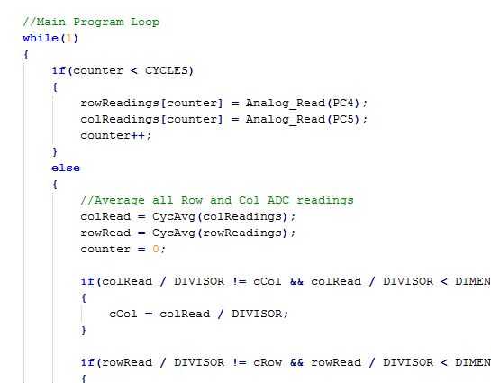 Después tenemos una muestra de los valores de ADC para la fila y columnas podemos promedio usando la función CycAvg. Esto es sólo una genérica función promedio que resume los valores y luego se divide por el número total de valores. No voy a hablar de ello aquí como usted puede encontrar en el código. Bien, ahora que tenemos las lecturas ADC que queremos de las macetas, tenemos que convertir esto en un número de fila y columna que podemos colocar el cursor ahí. Esto se realiza a continuación.
