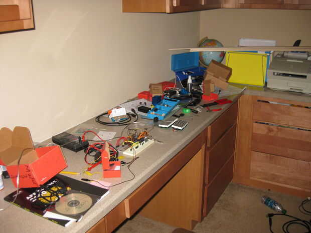 Después de ensamblar las tablas vas a querer averiguar lo que finalmente quieres hacer con él. De esta forma podrás añadir longitudes apropiadas de alambres para las macetas y los interruptores de la inclinación. Como se puede ver en la imagen, mi recinto requiere cables decentemente para colocar las macetas y tilt switches en el lugar apropiado.