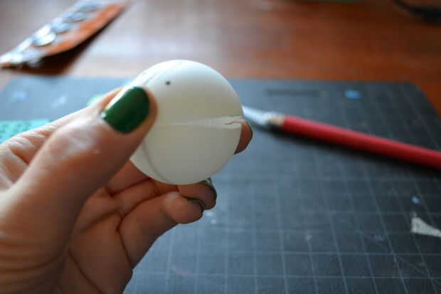 A continuación, finalmente es hora de abrir la pelota de ping-pong con un cuchillo Exacto. Echemos un vistazo a la pelotita de ping pong. Debería ver una costura que va alrededor de la circunferencia de la bola. No corte a lo largo o en esta costura. Tomar el cuchillo del Exacto y hacer una pequeña incisión. Gentlely pase el cuchillo en el plástico en una línea recta que tiene una longitud de aproximadamente la mitad de la circunferencia. Recuerda que tienes que pegar esto más adelante, así que trate de mantener este corte tan fino como sea posible. Y no corte la bola por la mitad!