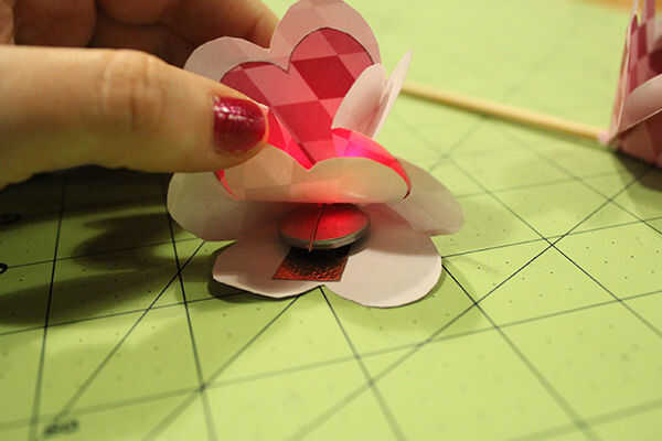 Por último, pop diodo LED por el agujero hecho anteriormente en el corazón más pequeño. Ahora no sólo esconden las entrañas de su diseño pero tienen un color dentro de su flor y un aspecto más realista con los pétalos añadidos!