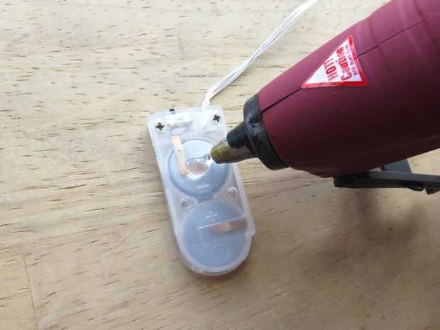 Decidir donde vas a colocar las baterías de las luces, asegurándose de que usted puede alcanzar el interruptor y la tapa que te permite cambiar las pilas. Aplique pegamento caliente en la parte posterior de la batería (no el lado que se abre) y pegarlos en su diadema.