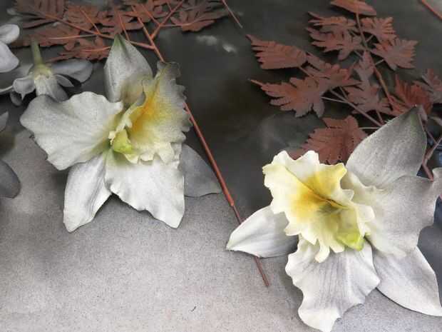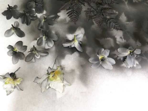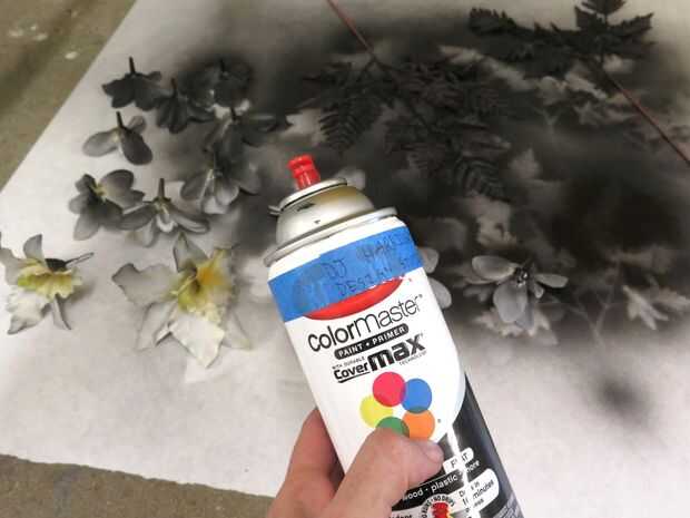 Primero quita un montón de mis flores de sus tallos y los ponen boca abajo sobre un pedazo grande de papel en una cabina de rociado ventilada. Utiliza una pintura de aerosol de ambiente seco, plástico rápida y empañan las zonas de las flores para crear a una especie de efecto de ombre. También pinté unas hojas que nunca terminó para arriba con.