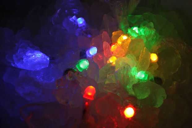 Difundir las luces alrededor del hielo en el refrigerador y revolver para arriba un poco para algunos de ellos bajo el hielo para crear el efecto que brilla intensamente.