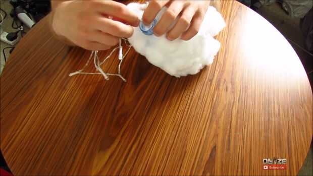 Así puede utilizar LED o luces de Navidad, pero luego llegas a pensar en una fuente de alimentación y cables. Tuve algunas luces con pilas. Ahora poner estas luces en una botella por su cuello. una vez que hecho pegamento la batería al lado de la botella con pegamento caliente. Asegúrese de que pegue la forma correcta, porque se necesita cambiar las baterías eventualmente. Cubren todo con algodón botellas cuello y batería paquete de la máscara en algodón. A continuación encuentra algunas lineas de pesca así que su menos visibles, si no tienes uno bien cadena de stiching hará muy bien. lazo alrededor de su nube a los dos lados y ahora se puede colgar al techo. encender la luz de su habitación y encienda su nube. Quedé realmente impresionado lo guay parece. por lo tanto ir adelante pruebalo.