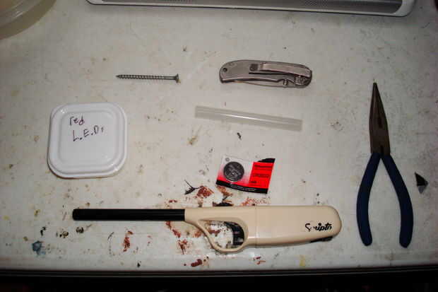 este frisbee fue pensado para que glow-sticks para conectarse, pero encontré que LED se ajusta a la conector cosa también.He utilizado LEDs 2x3mm azul y 1x5mm verde LED. Sólo fueron rescatados de otras cosas alrededor de la casa.Del LED todo conectar
