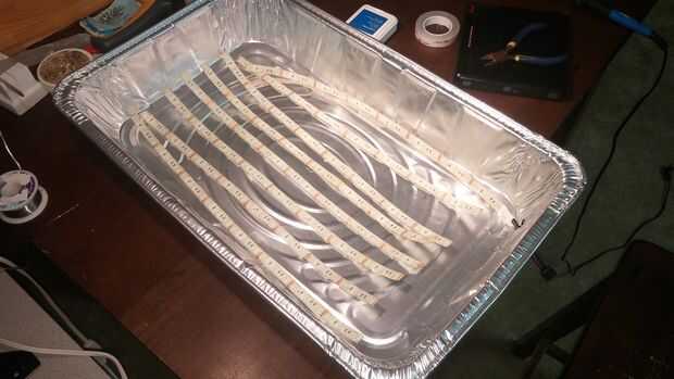 - Utilice la cinta de doble cara sobre las espaldas de las tiras de LED para fijar a la bandeja ya que soldar el cable en. Asegúrese de que sus tiras no provocar un cortocircuito en contactos en la parte posterior de la bandeja de aluminio. Si esto ocurre que usted puede cubrir la parte posterior de las tiras con cinta.