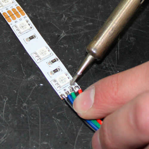 - Soldar los cables a los correspondientes 12V, rojo, verde, azul contactos, cableado todo en serie en un patrón serpentea sobre la bandeja