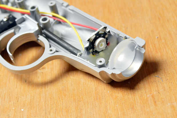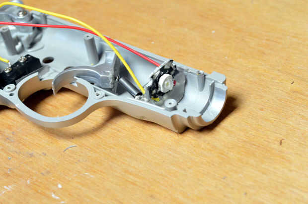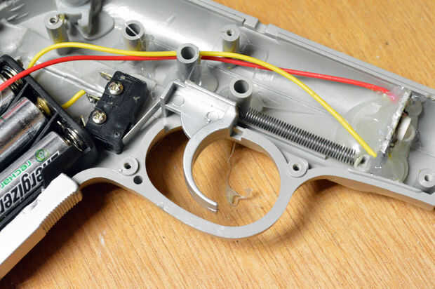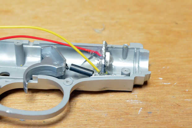 Asegúrese de que ha soldado todo correctamente y compruebe si el LED se enciende cuando se tira del gatillo. Lo hace! Buena.