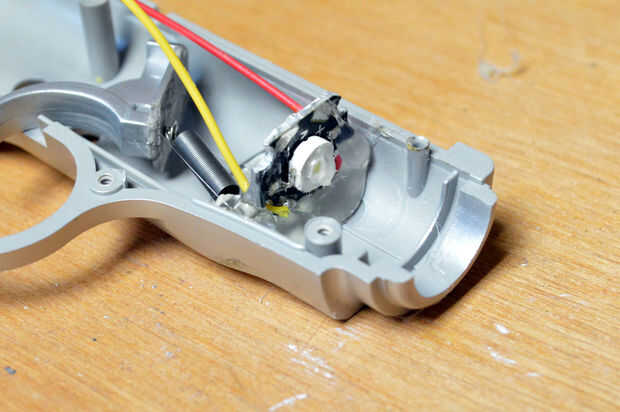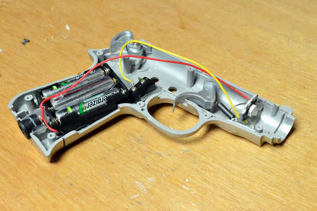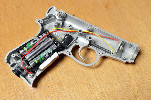 3. por último, pegamento en su lugar cualquier bit de la pistola que se llevaron a cabo en lugar por la placa de circuito o refuerzos que podrían haber eliminado para insertar las pilas en lugar