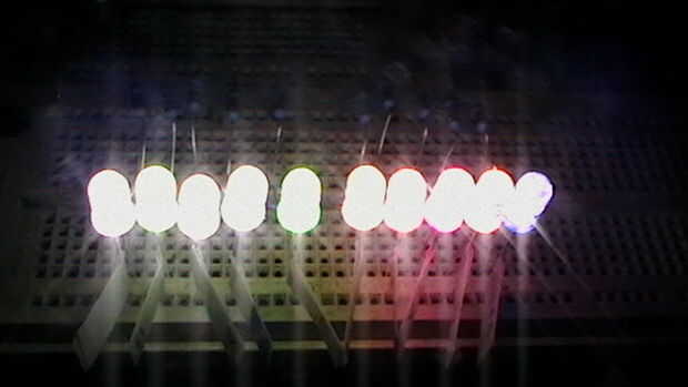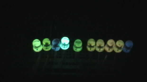 Verde, azul y Aqua son los colores solos que blanco puro encendido hasta y cuando fuera pero no cargan. El resto tienen un notable color diferente al blanco cuando se enciende y no carga cuando no directamente en la viga. Los colores son que un poco deslavados en los cuadros de los LED cuando se enciende para arriba pero son realmente muy notorio.