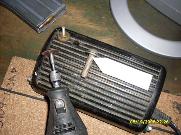 Para un perno que se puede taladrar un agujero a través de este paso sólo lo suficientemente grande como para encajar una pieza de dos pies de cable de calibre 12 a través de. tierra plana en el perno con mi dremmel para que mi broca tuvieran un lugar para empezar.