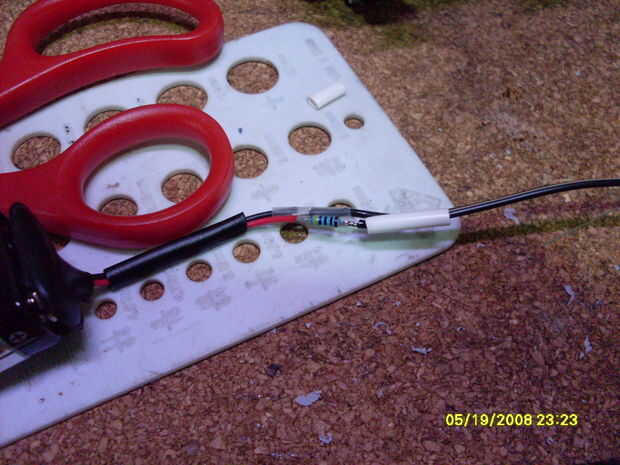 Luego Solde un resistor de 470 ohm a un clip de batería de 9 voltios. Añadir unos trozos de alambre de aproximadamente 1 pie largo cada una para el conmutador.