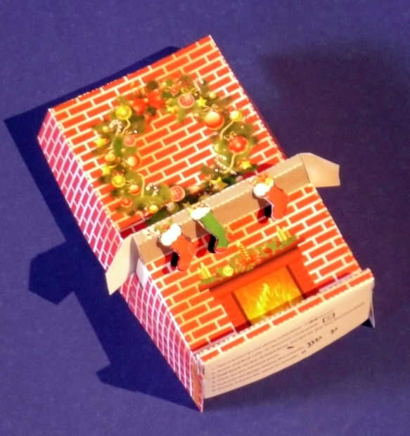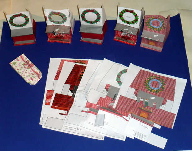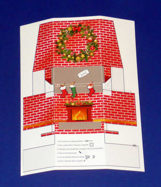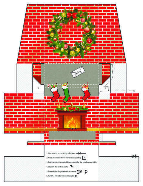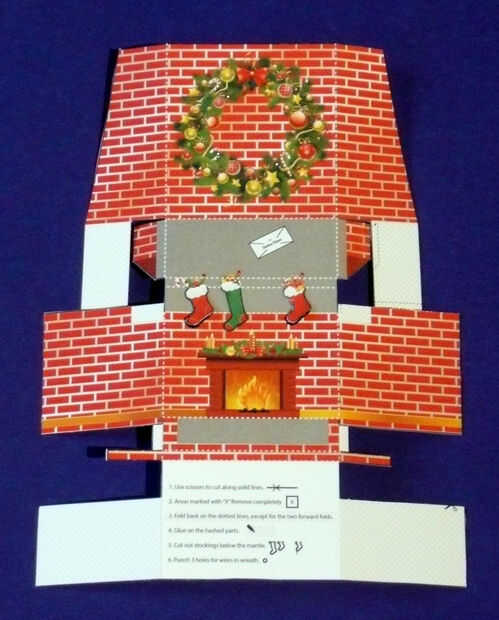 En primer lugar pegar las áreas grandes es mejor. Utilicé cola blanca, que se seca rápido si suavizar el pegamento con el dedo antes de pegarlas. Las pestañas de abajo queden contra el pliegue entre la chimenea y la pared. Las grandes pestañas en la parte superior se alinean con el borde exterior de la pared.