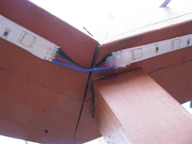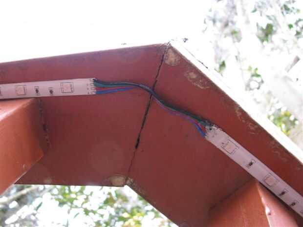Pele apagado el forro de la tira de LED flexible y pegarlo en la parte inferior de la barandilla limpia y seca.  Asegúrese de mantener como derecho e incluso como posible-no te preocupes si tienes un área donde no está pegando así (poner silicona sobre todo para mantener en su lugar también).