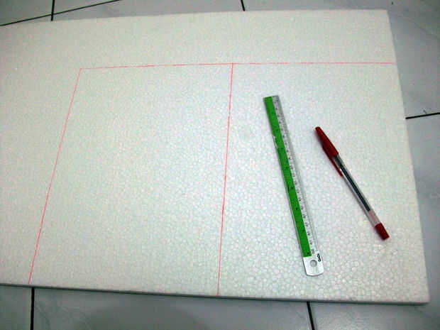 Hacer un patrón de corte con regla y lápiz. Por el tamaño, estoy usando papel A4 para obtener una referencia. No utiliza un marcadores, no conozco la composición de la tinta en el marcador, pero puede hacer una espuma de poliestireno fundido. (ver imagen 2)