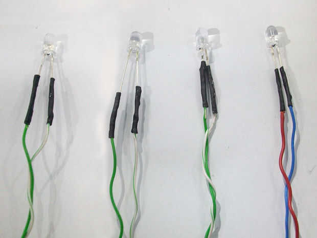 Soldadura ánodo y el cátodo del LED con el cable de puente y la tubería del encogimiento es esencial para evitar un cortocircuito. Hacer 4 de estas. (ver imagen 1)