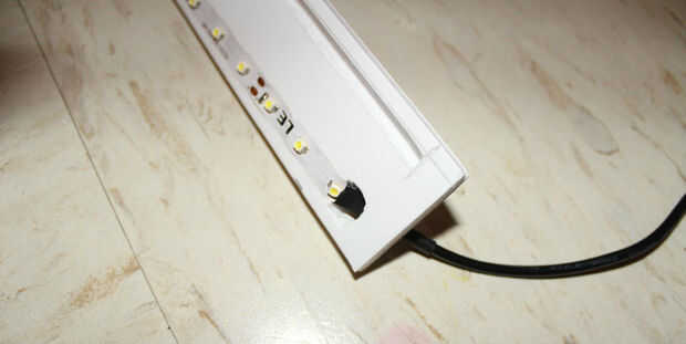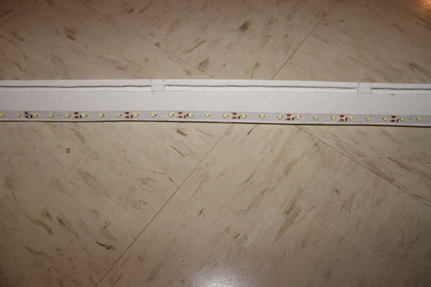 Más tiras de led tienen un adhesivo de nuevo a ellos, en ese caso, apenas pele apagado el forro y pegue la cinta tan recta como sea posible al borde de la plataforma. Si la tira de led no tiene un adhesivo detrás, entonces simplemente utilice gotas de pegamento caliente para fijar la tira a la parrilla.