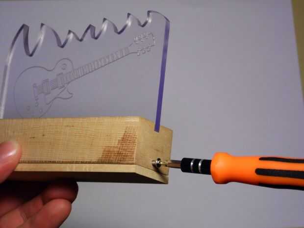 Después de que el pegamento de madera aplicado al base pie ha alcanzado su máxima fuerza, empuje suavemente el pie del cuerpo base fresado. Si todo está en su lugar, aplique los dos tornillos en los lados.