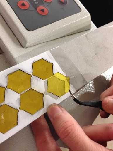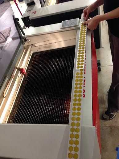 Estoy utilizando LEDs que necesitan un disipador de calor. Elegí una de aluminio barra 1/2" x2"x 48"que he comprado de Metals4U en Austin, Tx para sobre recogida local $19. Yo con chorro de arena el bar Techshop en preparación para la capa de polvo. Los LEDs son hexagonales formado, así que corte a una máscara de 1/2" cinta del Kapton (Ebay para $4, precios locales hasta $100 - loco derecho?) en el laser en la forma de los LEDs. Kapton soporta 100s de grados de calor. Usé un pedazo de papel para sostener la cinta kapton y crear una plantilla para colocar las máscaras en la barra. Más tarde encontré que puede poner la cinta directamente en el láser. Si lo hice otra vez haría las piezas conectan en 1 tira larga para fácil colocación y remoción. Colocó en la barra de preparación de la capa del polvo