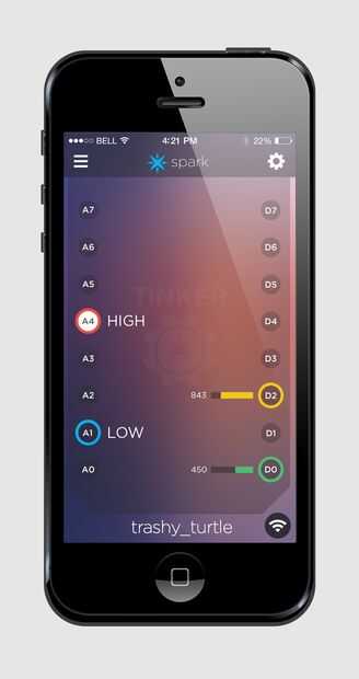 Ahora vamos a nuestro núcleo de energía. El sitio explica cómo registrar y conectar su base. Mi grupo de TechShop todos utiliza PCs así que decidí usar un MAC solo para mostrar que es posible. Descargue el software y siga las instrucciones para registrar su núcleo. Hay varias formas de hacer esto. He descargado la aplicación de la chispa en mi iPhone. Ir a la tienda de app (o Google Play para Android) y obtener la aplicación siga las instrucciones para instalar y registrar la aplicación y conectarse a su base el mismo WIFI como el núcleo. Luego lo conectará a Tinker, la aplicación por defecto en el núcleo de la chispa. Es poner hacia fuera al igual que las clavijas en su núcleo. Si te pierdes, si haces un reset de fábrica por defecto Tinker.