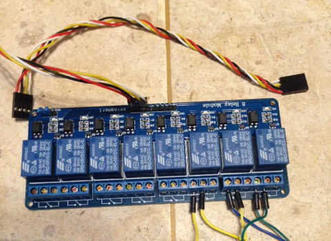Puede omitir este paso en conjunto si querías apagar las cuerdas LED PWM para un ciclo de trabajo de 0% y energizar todo el tiempo al regulador. Decidí hacerlo así para mostrar el poder de estos relés. Pueden cambiar el voltaje a 120 v o AC 250V incluso a 10 amperios o cambiar una tensión más baja como 12 v DC. Esto podría utilizarse para luces de Navidad, bombas de agua o lo que quieras conectado y apagado. Compré un conjunto premontado de 8 relés en Ebay. Eran $6,99 en el momento de Sain Smart. También tienen relés de estado sólido que pueden cambiar más rápido. Sospecho que son cero dispositivos de cruce que requieren una señal de AC o señal de DC pulsante que cruza 0V antes de que cambiará. Estos relés mecánicos no requieren esto. Son ópticamente aisladas. Esto significa que los altos voltajes en la salida no están eléctricamente conectados a la base de Spark.IO. Un haz de luz desencadena internamente. Apenas enganchar encima de las señales digitales a las entradas de canal de los relés y los + 5V y tierra y el corazón les va encender y apagar. Un pequeño LED para cada canal muestra su estado. También oirá un clic cuando cambia.