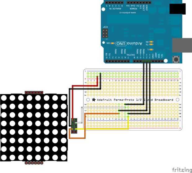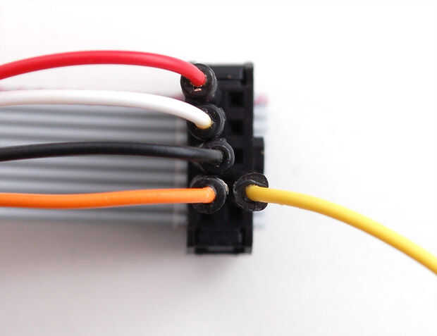 El panel de matriz de 16 x 24 se montarán en la parte trasera de la moto. Conectar 5 cables a la matriz; se refieren a la imagen de los puentes en los jefes femeninos de los pins específicos y orientación. Cada uno de estos cables/puentes debe conectarse a diversas filas en el protoboard (5V y GND deben fijarse con pernos de ferrocarril de la protoboard). Conecte un cable JST a cada uno de estos pines diferentes. Correr cables JST (u otro cable) a lo largo de la moto a la Arduino montado en el manillar. Aquí es donde los cables de la matriz necesitan para conectarse a Arduino para que coincida con el código: