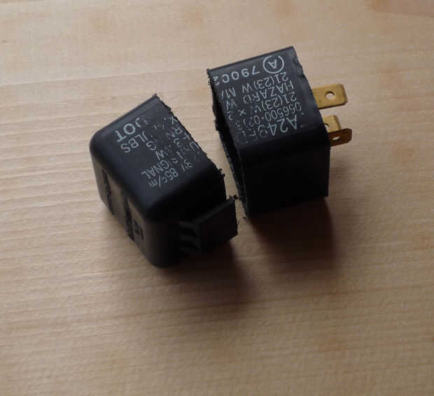 Algunas unidades intermitente pueden ser desmontados. Si usted puede desarmarlo, entonces por todos los medios hacerlo. En este caso tenía en maceta el circuito de sincronización, usé una sierra para metales para cortar abierto la caja de interruptor intermitente.