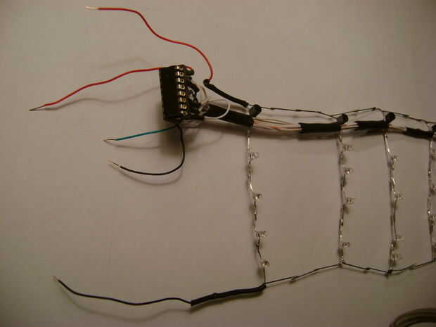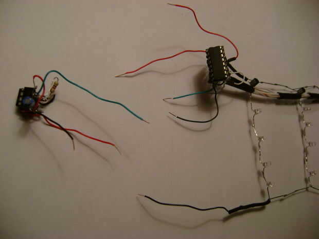 La soldadura de la salida del reloj (cable verde, el pin 3) a la entrada del chip contador (cable verde, pin 14).