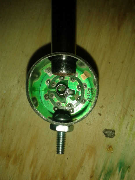 LED cabeza tendrá el cable negativo conectado al máquina de tornillo y tuerca y el positivo se unirá a la primavera en el centro de la platina verde.
