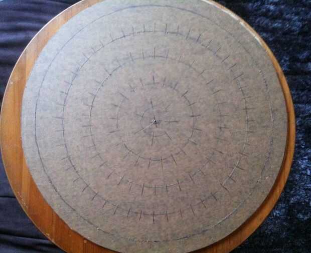 5. abrir el compás a 50mm (para hacer un círculo de 410mm), etch ligeramente, entonces aprovechar el círculo con lápiz