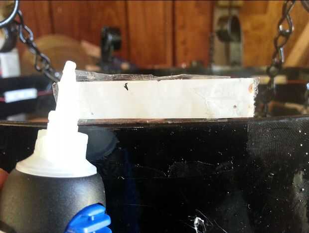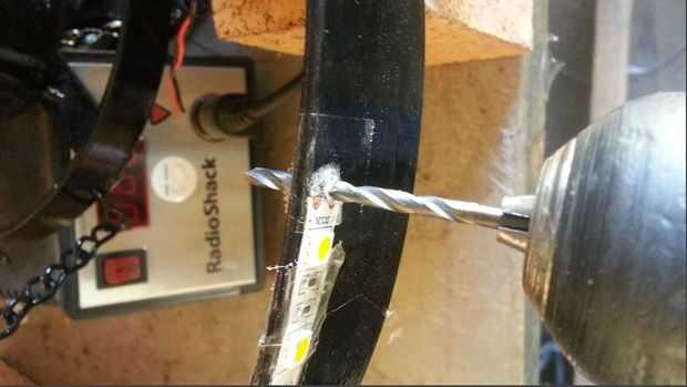 Ahora que el LED se suelda y su lámpara es pintado y secado es hora de garantizar el. Decidí perforar para ejecutar los cables en la parte frontal de LED. Esto fue para fines cosméticos y no es necesario. Usé pegamento que se adhiere al metal y plástico.