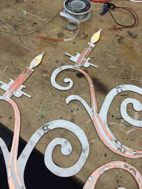 Continuar sus dos pistas de la cinta de cobre a lo largo de los tallos hacia el centro del candelabro. Si los brazos de araña son demasiado pequeños para mantener dos líneas de cinta de cobre, tienes dos opciones. Tampoco puede cortar la cinta de ajuste o puede poner una pista cubierta con cinta adhesiva y colocar la segunda pista. Hice el corte de la opción de la cinta, que muy bonito, sin embargo no era casi tan conductivo como sería con la más amplia superficie ofrecida por la pieza completa de la cinta.