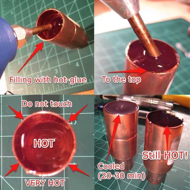 En serio: no toque las piezas de cobre hasta que el pegamento interior se enfríe completamente. Cobre conduce mucho calor y después de poner pegamento caliente todo lo que en allí el calor es tratando de escapar. El calor que escapa es lo que hace que la superficie del cobre muy caliente.