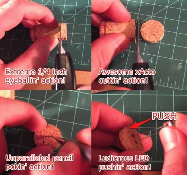 -Una vez que hayas hecho los agujeros empuje los cables del LED por el disco de corcho para que se sienta justo en la parte superior del corcho.