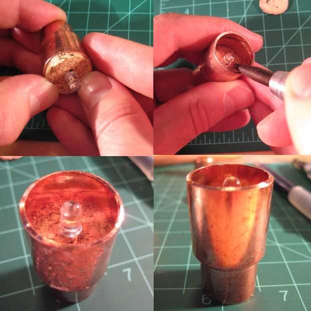 Ahora necesitaremos el disco de corcho con el LED en 3/4 pulgada de cobre de 1/2 pulgada del asiento pieza reductor. Para hacer esto Presione el disco de corcho en el lado más grande del cobre reductor. Debe ser un ajuste ceñido. Usted querrá empujar uniformemente alrededor por todos lados como hacerlo. Para obtener el disco un poco más profundo utilizando un lápiz o los alicates de punta para empujar alrededor de los bordes del disco. No establezca el disco demasiado lejos si no la luz de lo LED no será tan brillante. Idealmente, usted quiere la corona del LED en la parte superior del cobre como se muestra en la esquina inferior derecha de la foto.