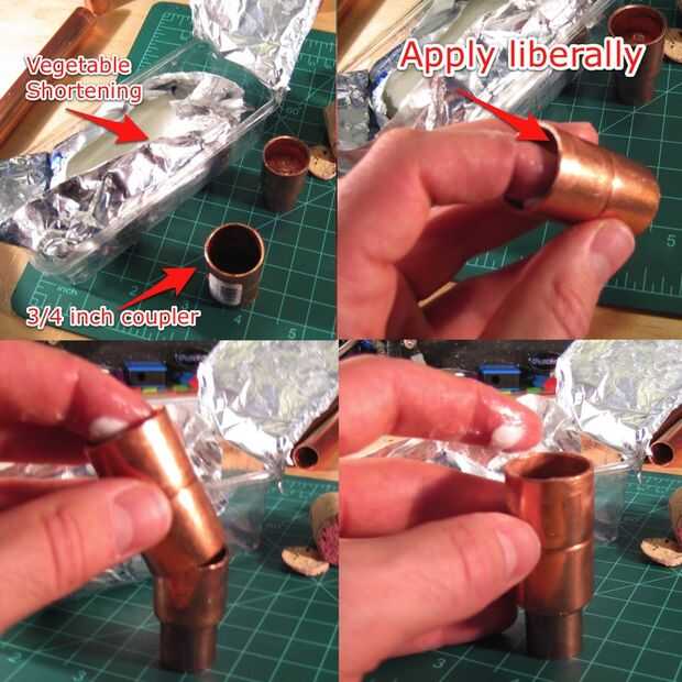 Aplique una cantidad abundante de manteca en el interior de la pieza de acoplamiento de cobre de 3/4 pulgada el vegetal (la misma cantidad que se usaría si se hacer brownies y tuvieron que untar la parte inferior de la pan... mmm... brownies). Una vez bien engrasado, coloque la pieza de acoplamiento sobre el reductor (la parte con el LED) como se muestra en los dos cuadrantes inferiores de la imagen de abajo.