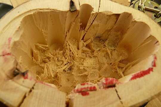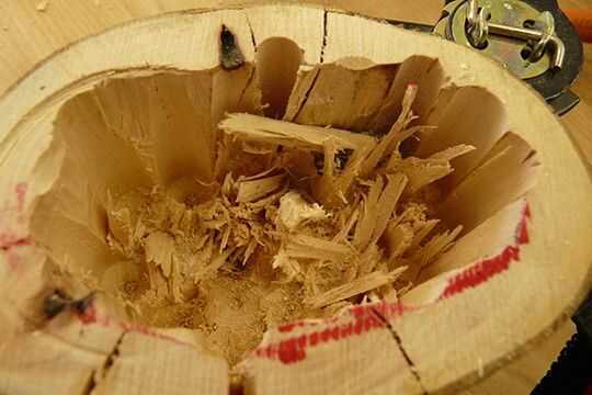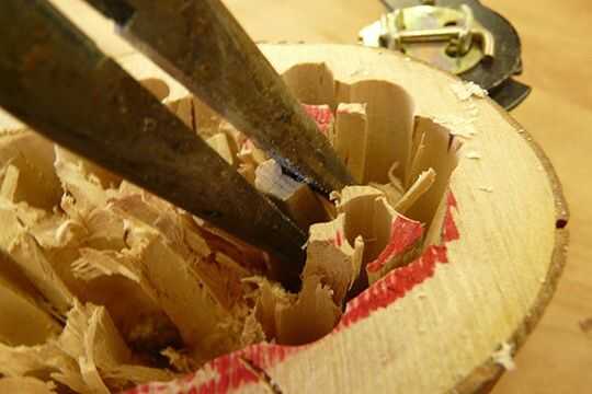 Mientras que dejando el lazo abajo todavía la base, empezar a usar el martillo y cincel para quitar la madera de la base de la lámpara. También usé un par de alicates de punta de aguja para extraer la madera.